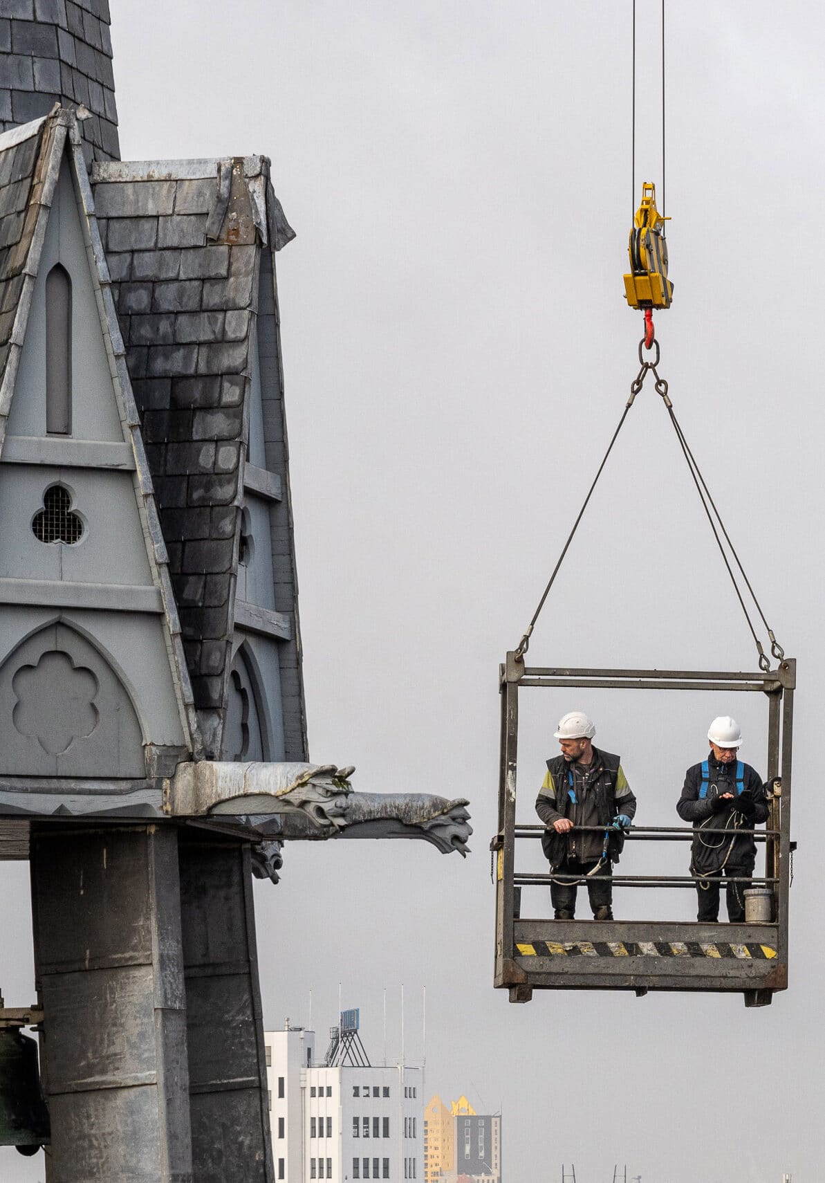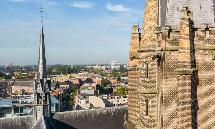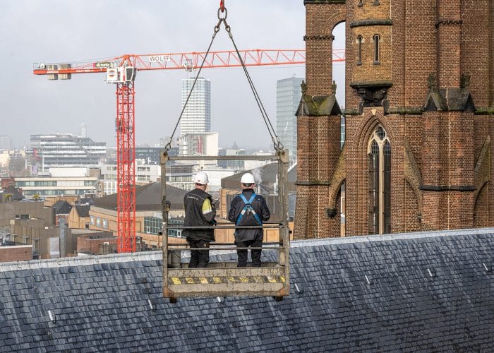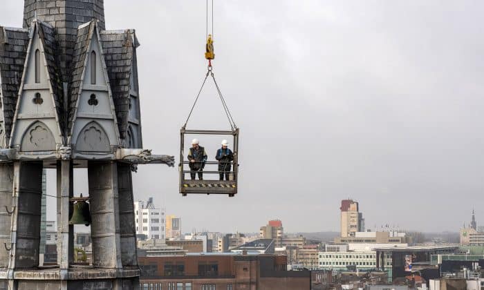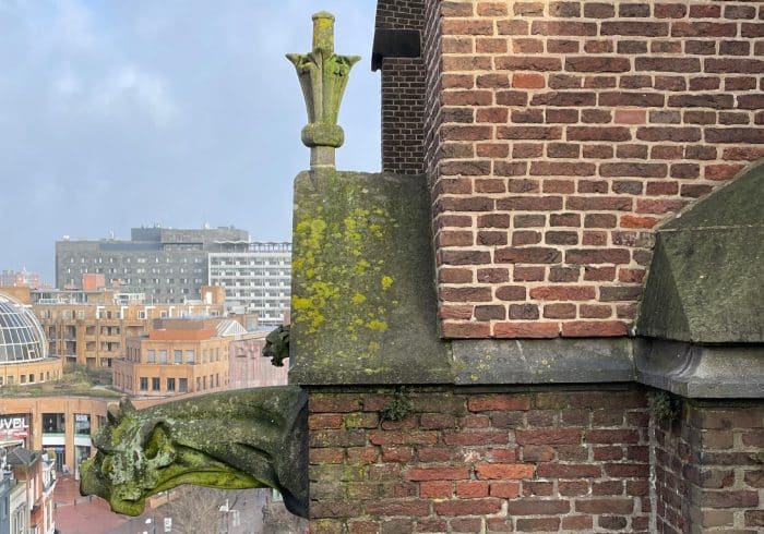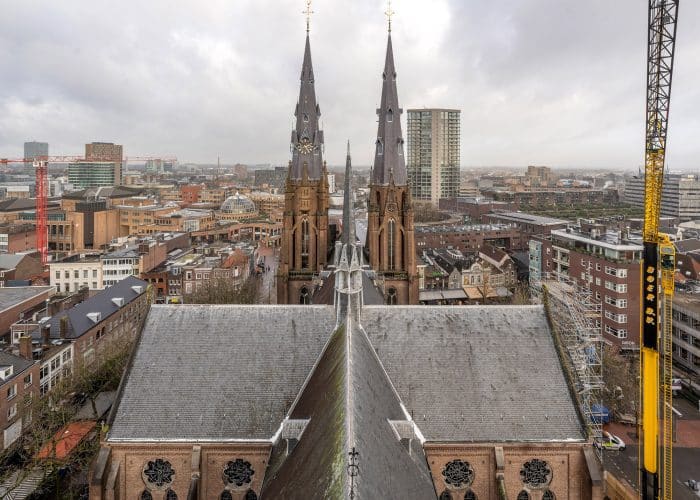 Een klus met uitzicht! Afgelopen week werkte Gerard Vreugdenhil op grote hoogte om de Catharina kerk in Eindhoven grondig te inspecteren. De restauratiewerkzaamheden zijn inmiddels in volle gang en ook de vieringtoren staat hierbij op het programma. Het bijna 3 meter hoge kruis zal voorzichtig worden ontkoppeld van de toren om te restaureren en opnieuw te voorzien van bladgoud. Geen gemakkelijke opgave, want hiervoor zal een steiger bovenop het middenschip van de kerk geplaatst moeten worden; op zo’n 32 meter hoogte!