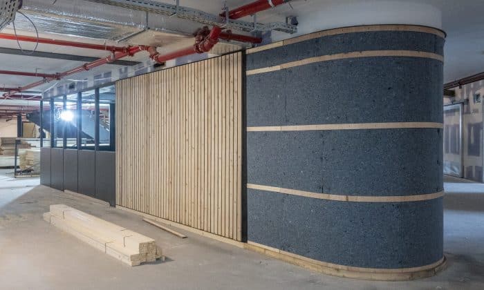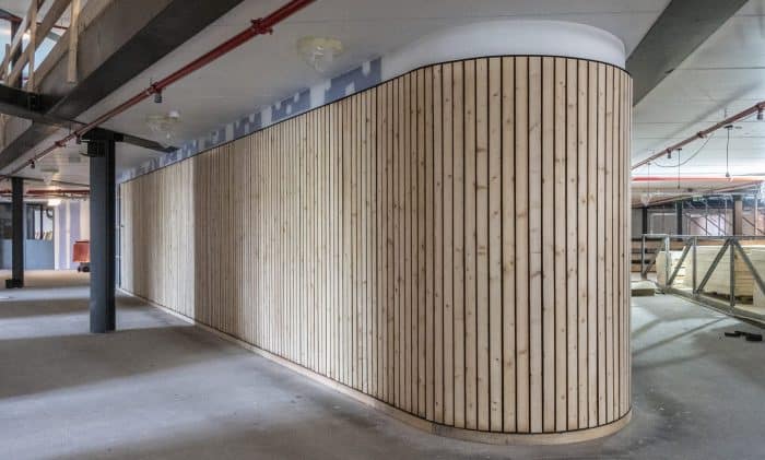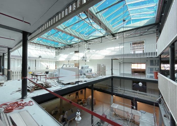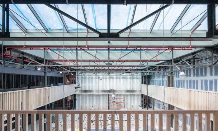 “Het bestaande gebouw was behoorlijk groot in omvang en daardoor ook erg donker in het midden van het pand. Om die reden hebben we boven het centrale hart grote daklichten in combinatie met meerdere vides ontworpen zodat het natuurlijk daglicht helemaal tot in de kelder van het gebouw reikt. Binnen de vides zijn verschillende bruggen ontworpen die als flexplekken gebruikt kunnen worden.”, vertelt Allard. De oude dakspanten zijn hergebruikt voor de constructie van het nieuwe dak en ook het hout uit de oudbouw krijgt een nieuwe bestemming als balustrade. Unknown Group, de eigenaar van de Titaan, gaat invulling geven aan de groen-strategie binnen het gebouw.