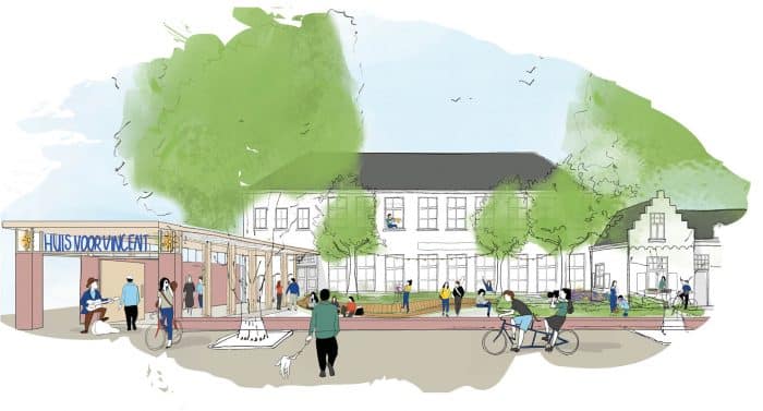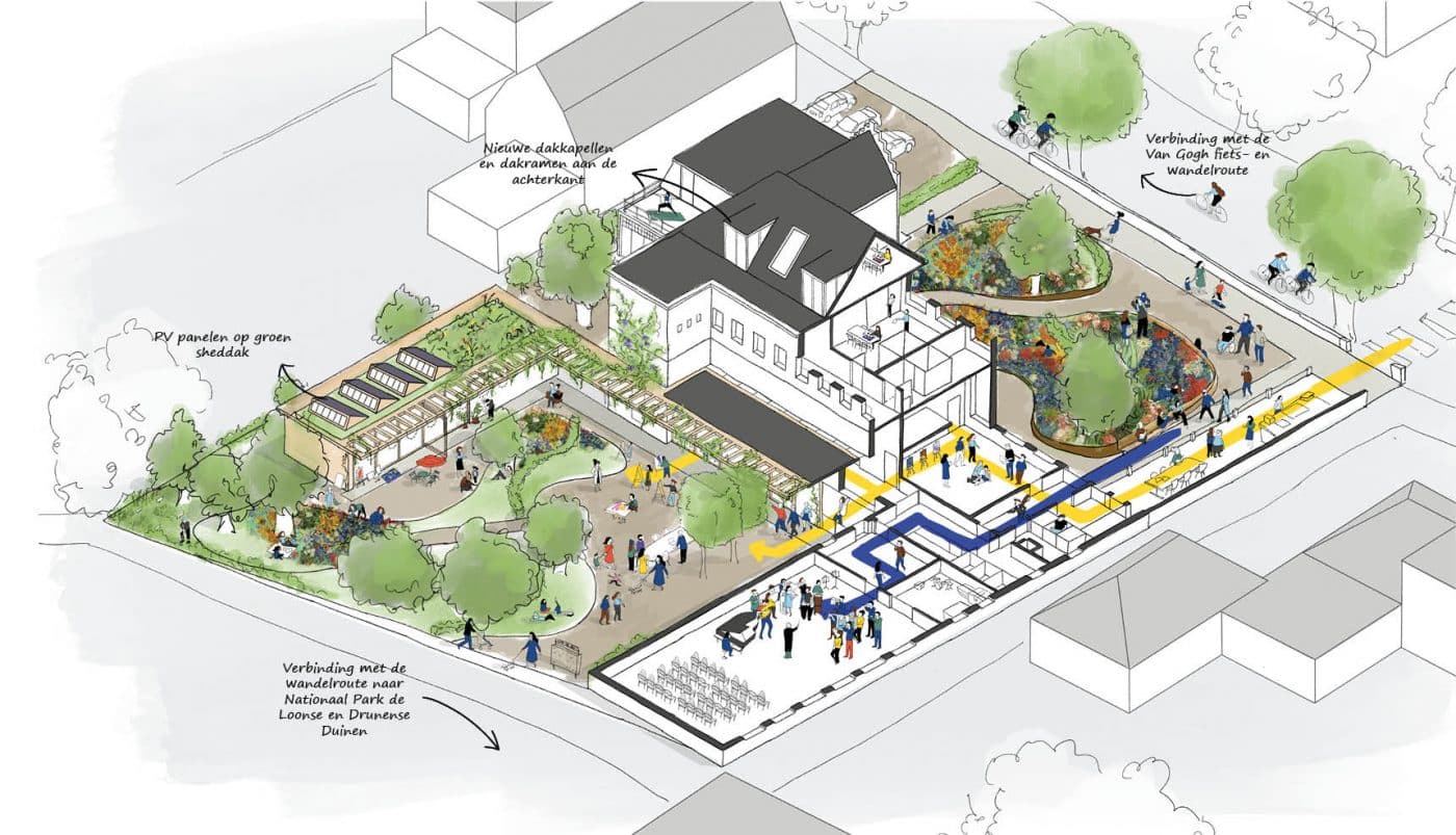 Met een knipoog naar het verleden wordt het gebouw door een nieuw entreegebied toegankelijker en krijgt de voortuin weer een inclusief karakter. Door slim om te gaan met de inpassing van het programma is het mogelijk om de achtertuin te voorzien van een transparante serre en een paviljoen. Het leven in het gebouw strekt zich uit tot in de gebruikstuinen. Er is onder andere ruimte voor sociale interactie en het exposeren van kunst. Aan de voorzijde groeien bloemsoorten uit de tijd van Van Gogh waarvan zelfs het pigment kan worden gebruikt om mee te schilderen!