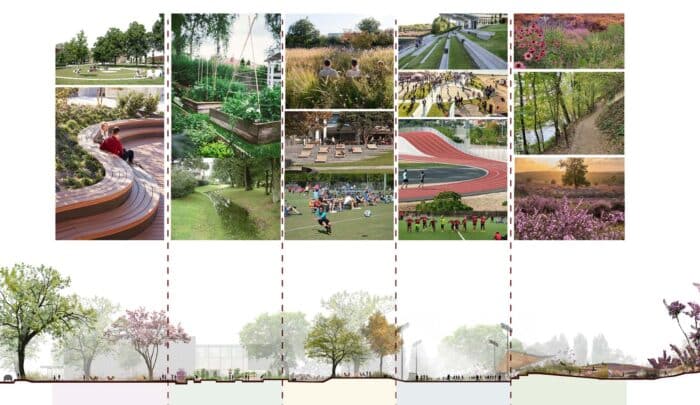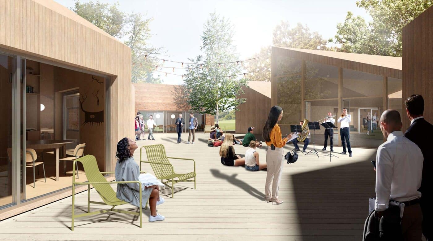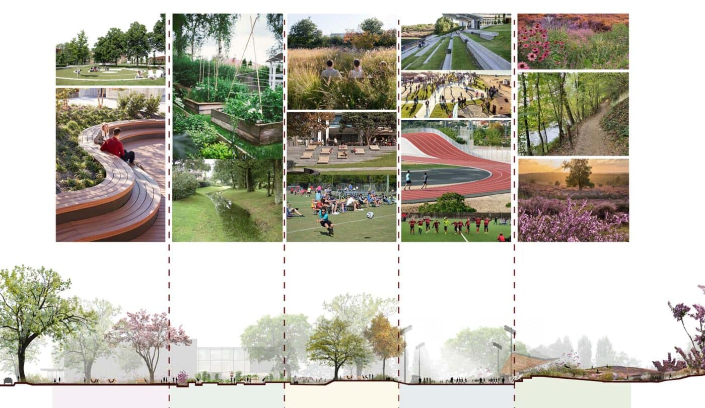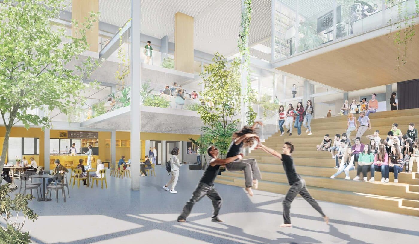 Het vernieuwde CSG is een toekomstbestendige plek waar leerlingen, docenten en buurtbewoners op natuurlijke wijze samenkomen. Door het gebouw constructief te openen stroomt er letterlijk lucht en licht het gebouw binnen. Er komen nieuwe centrale ontmoetingsplekken voor alle leerlingen met onder andere de (groene) aula en het high-tech atrium – de twee verbindende ‘harten’ van de campus. Rondom het atrium zijn verschillende werkruimten ontworpen, en op het terrein zijn straks diverse leer-paviljoens te vinden. De campus voelt als een dorpse gemeenschap waarin rust en reuring naadloos samengaan.