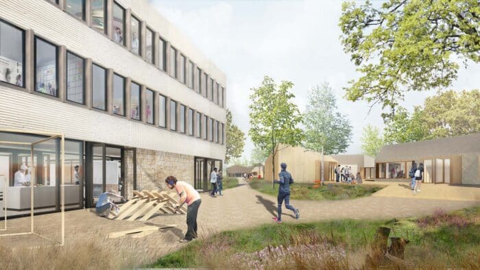 De natuur, leren door te doen en een hecht gevoel community – in Twents dialect ook wel noaberchap genoemd – waren belangrijke pijlers voor de vernieuwing van het CSG. Op het vernieuwde campusterrein komen twee locaties met maarliefst 1400 leerlingen samen. De opdrachtgever beoogde een totale sloop-nieuwbouw, maar het ontwerpteam wist hen te overtuigen van een duurzaam transformatie ontwerp.