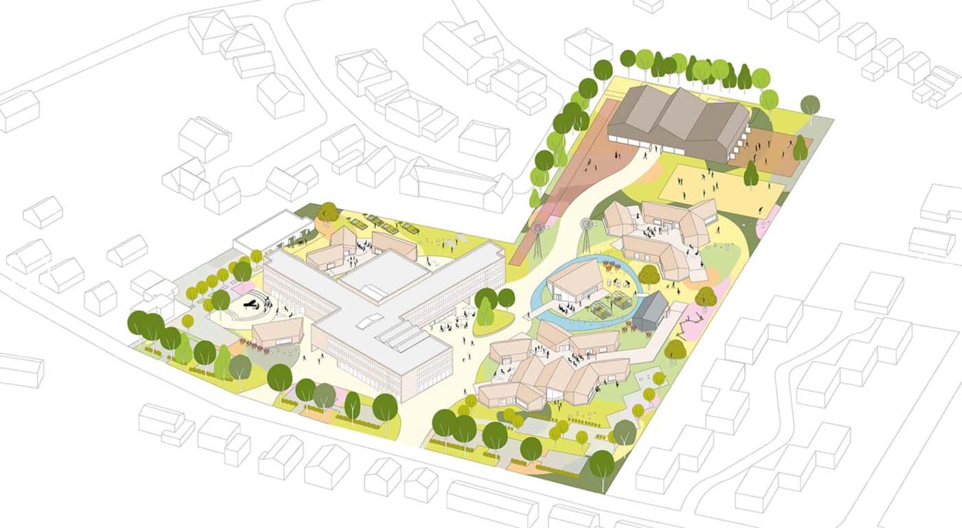Het bestaande gebouw maakte een sombere indruk met veel lange donkere gangen en eigenlijk geen kwalitatieve ontmoetingsplek. Daarbij vroeg de opdrachtgever juist om een school zonder gangen; een school in het teken van samenwerken en interdisciplinair onderwijs, waarbij onderwijsruimtes en binnen- en buitenruimtes in elkaar overgaan. Na zorgvuldig onderzoek van het bestaande gebouw zijn de kansen in beeld gebracht om de structuur te hergebruiken voor het nieuwe ontwerp. De bestaande bouw wordt krijgt de nieuwe rol van het ‘moederschip’ omringt door diverse nieuwbouw leerpaviljoens, die ook na schooltijden gebruikt kunnen worden voor uiteenlopende doeleinden.