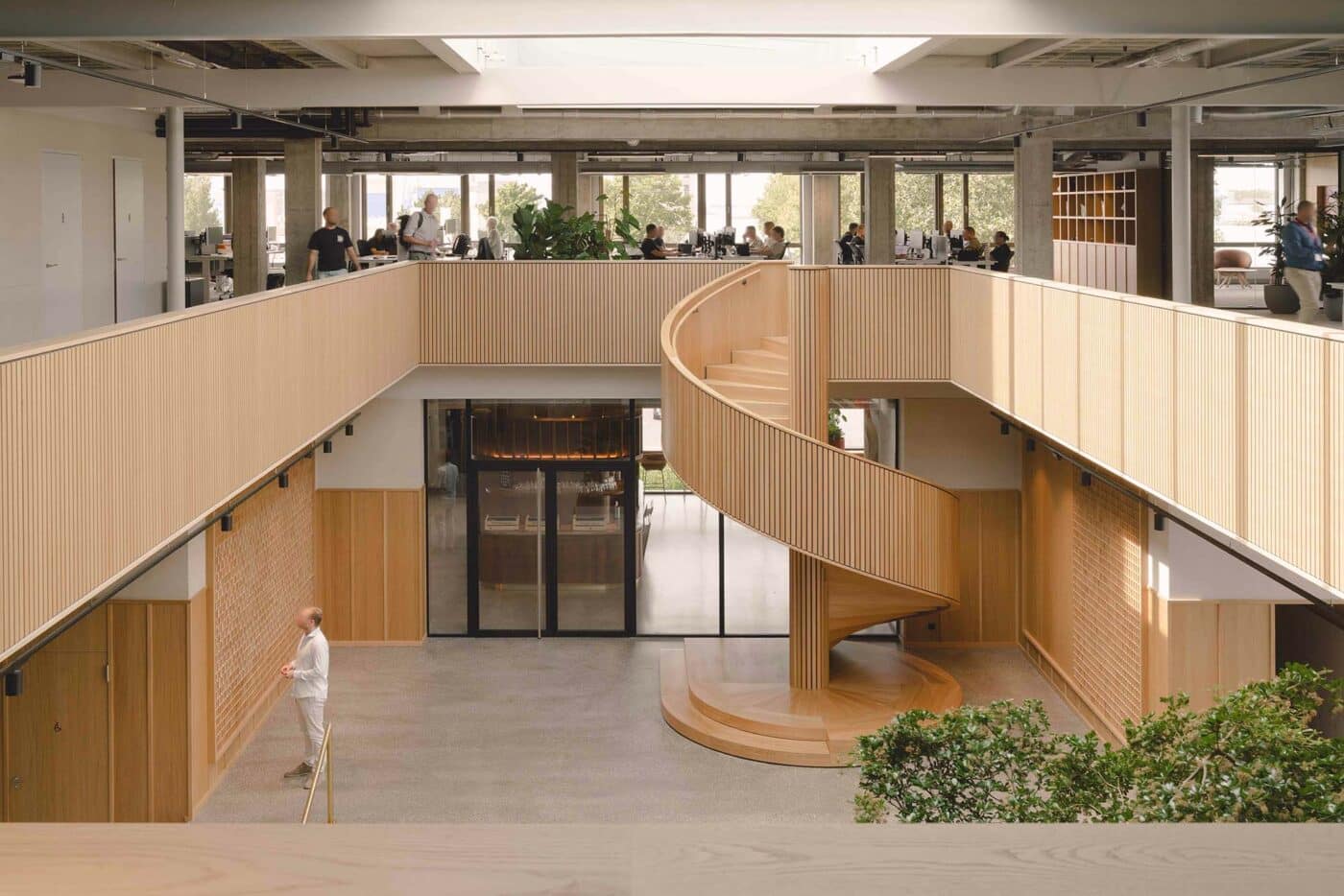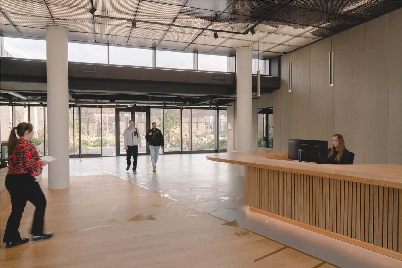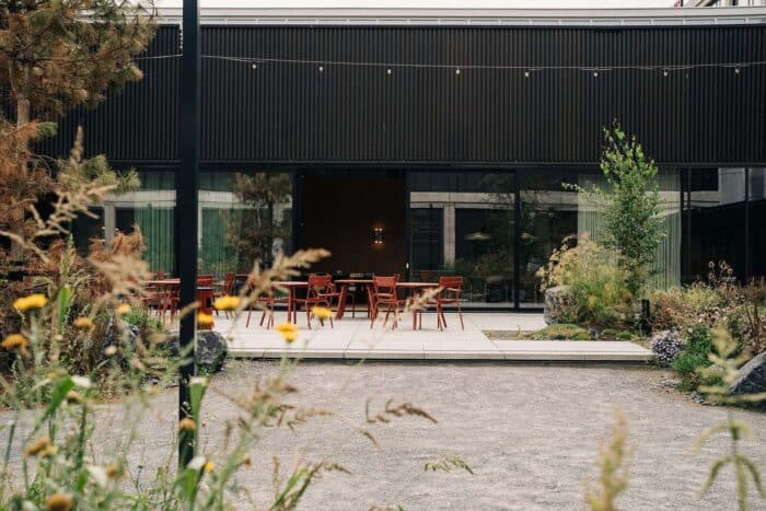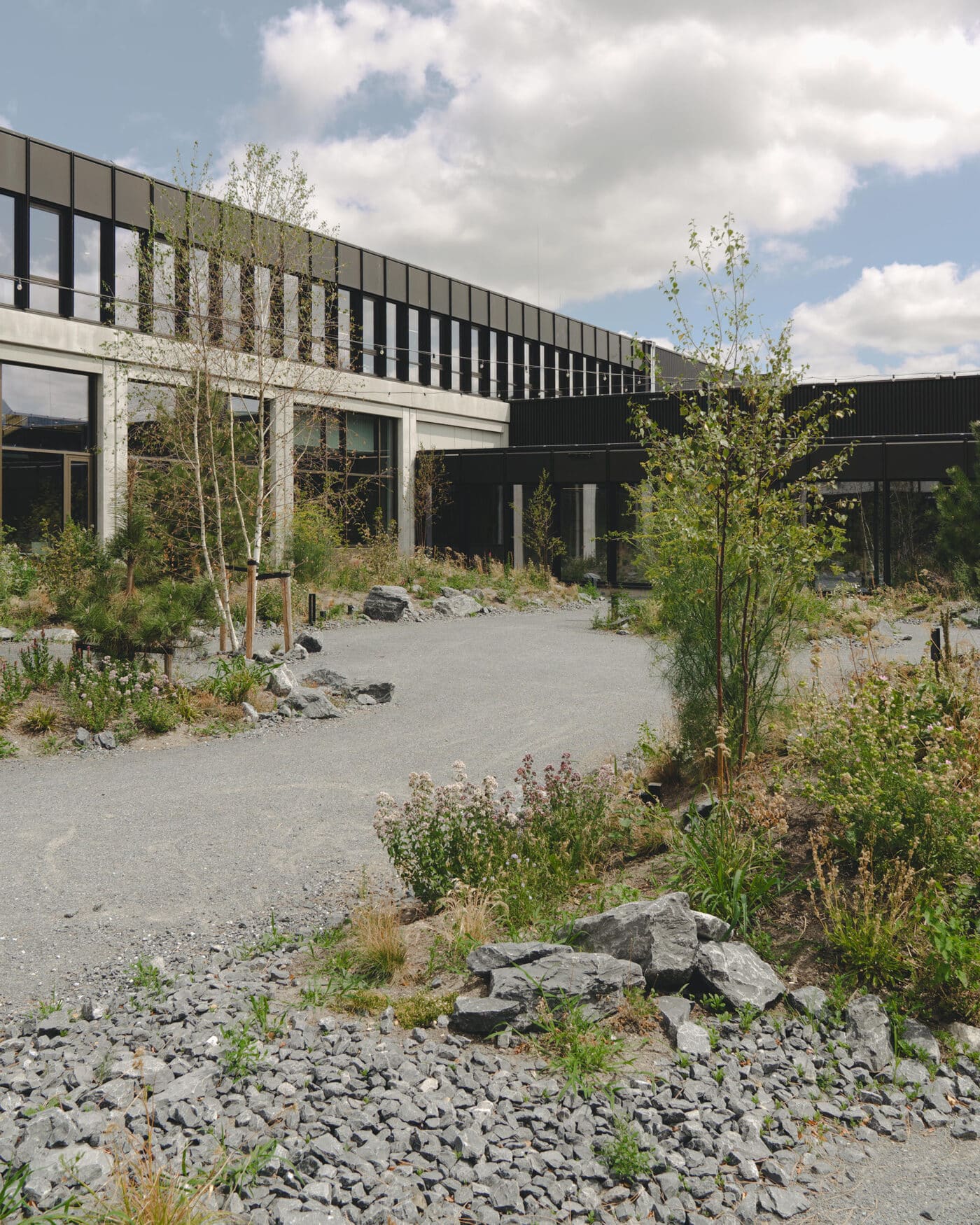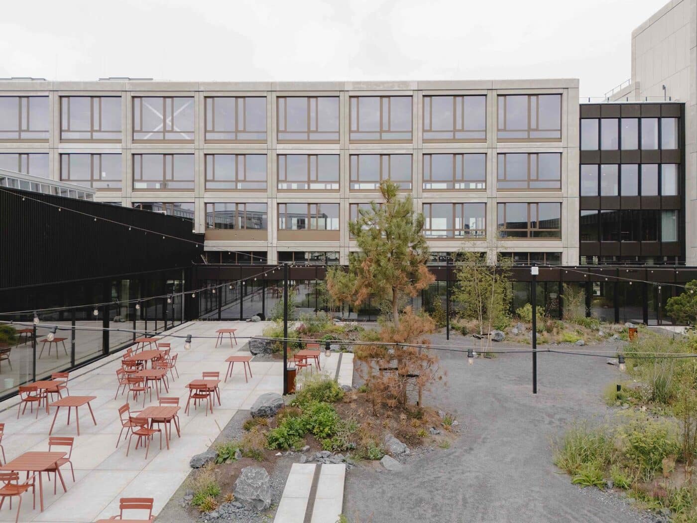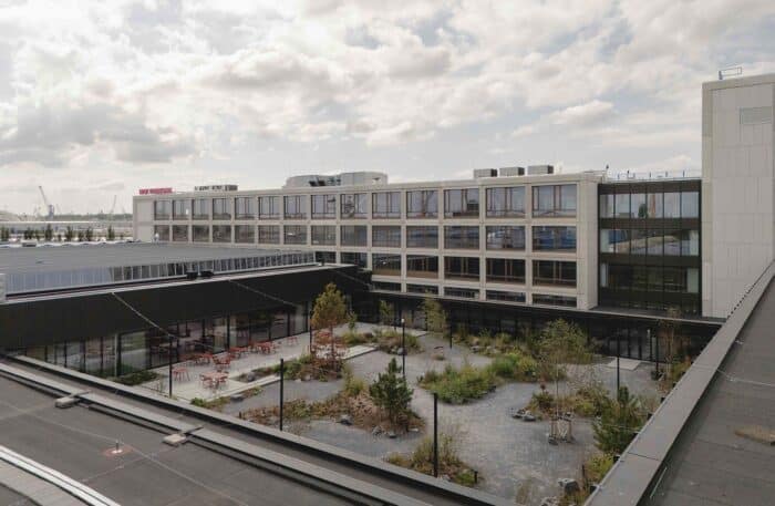 De oude ingang voor vrachtverkeer is getransformeerd tot royale verwelkomende entree met direct zicht op de binnentuin. Geïnspireerd op het contrast tussen de harde kades en de weelderige slikken van de oude rivier is het omliggende terrein een eruptie van de natuur dwars door de betonplaten heen. Frisgroene overplanten die tussen de basaltoever doorschieten. Een industrieel landschap waar de kades weer gebruikt worden door de mensen die er werken. De oude expeditieplaats is getransformeerd tot een luwe verblijfstuin met terras voor het restaurant en flexibele buitenwerkplekken. Verborgen midden in het gebouw ligt deze plek in de luwte van de wind en volop in de zon. Rondom deze tuin ontstaan nieuwe assen die als straten de verschillende gebouwdelen als geheel verbinden. Langs de gevels van het gebouw vormt het terrein een vanzelfsprekend verlengstuk van de haven, gematerialiseerd met inheems groen en basaltstenen.