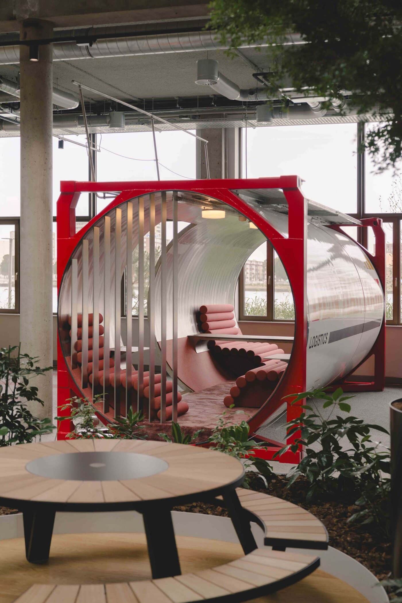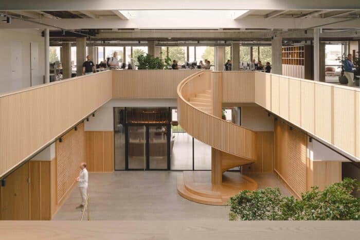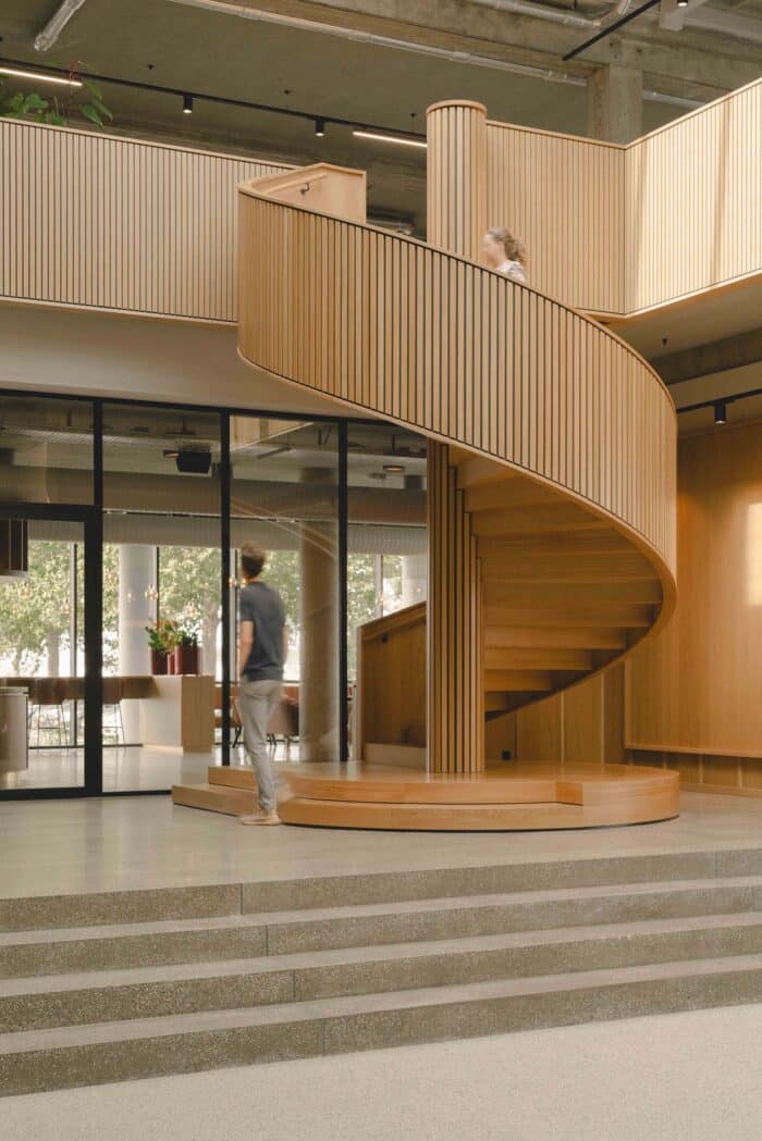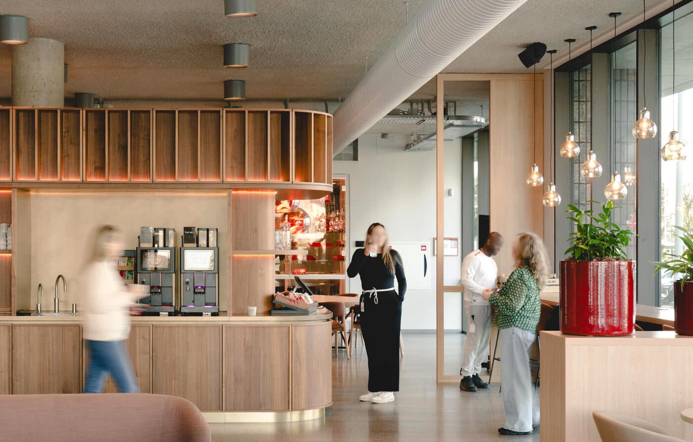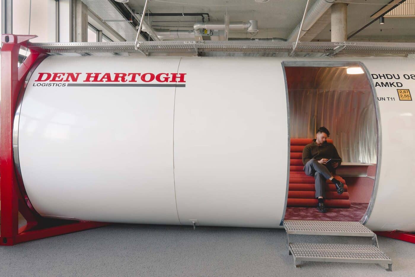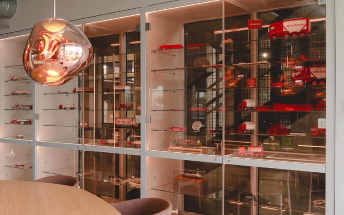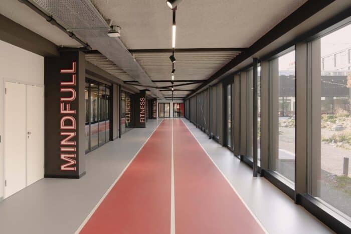 Basecamp is meer dan een werkomgeving: het is een fysieke vertaling van de cultuur van Den Hartogh. De royale nieuwe entree is direct verbonden met een koffiebar; stijlvol ingericht in donkere houttinten en messing details. Een wandvullende vitrinekast toont de rijke historie van het familiebedrijf als levend archief vol objecten en verhalen. Ook de Den Hartogh-visie op fun in business kreeg een ruimtelijke vertaling, een bewuste zoektocht naar de balans tussen werken en ontspannen. Zo leidt de route naar de fitnessruimte langs een eigen renbaan, staat centraal op begane grond een ‘denktank’ in een omgebouwde tankcontainer en wordt in de binnentuin dagelijks een potje jeu-de-boules gespeeld. Verspreid door het gebouw liggen tien karaktervolle stijlkamers, elk geïnspireerd op een facet van de Den Hartogh-cultuur. Er is een zachte vergaderruimte met uitzicht op de binnentuin, een projectkamer met geperforeerde gordijnen die het zicht focussen op een groot scherm, en een creatieve ‘muziekkamer’ vol platen, gameconsoles en brainstormtools. De ruimtes zijn ontworpen voor verschillende momenten in het werkproces – van focus tot co-creatie – en bieden telkens een ander ruimtelijk klimaat. Na werktijd kan er gesport worden bij de in-house fitnessruimte.