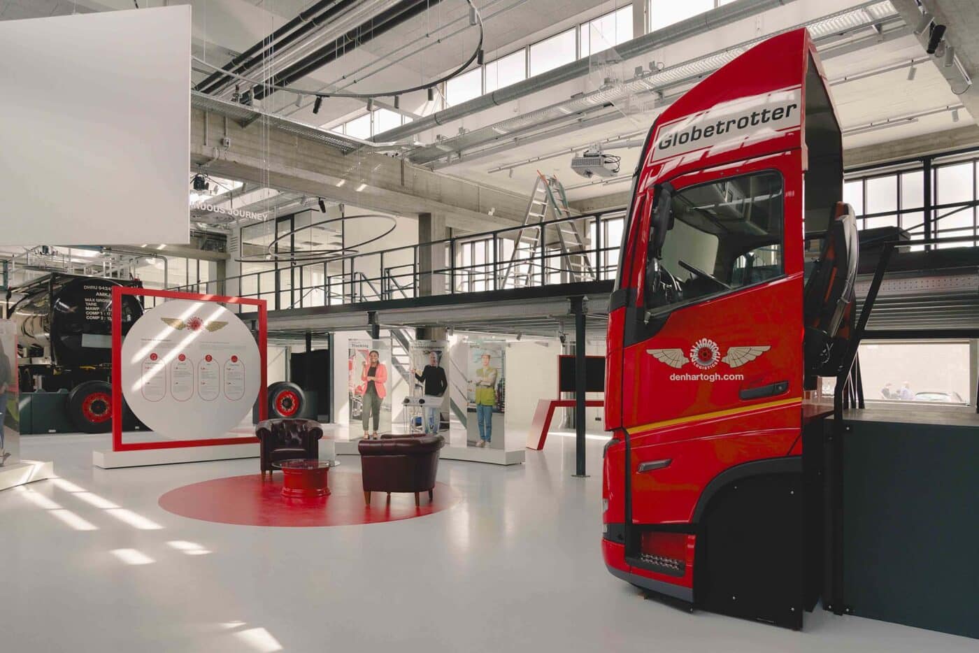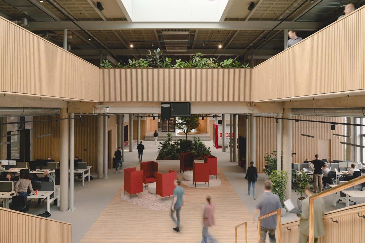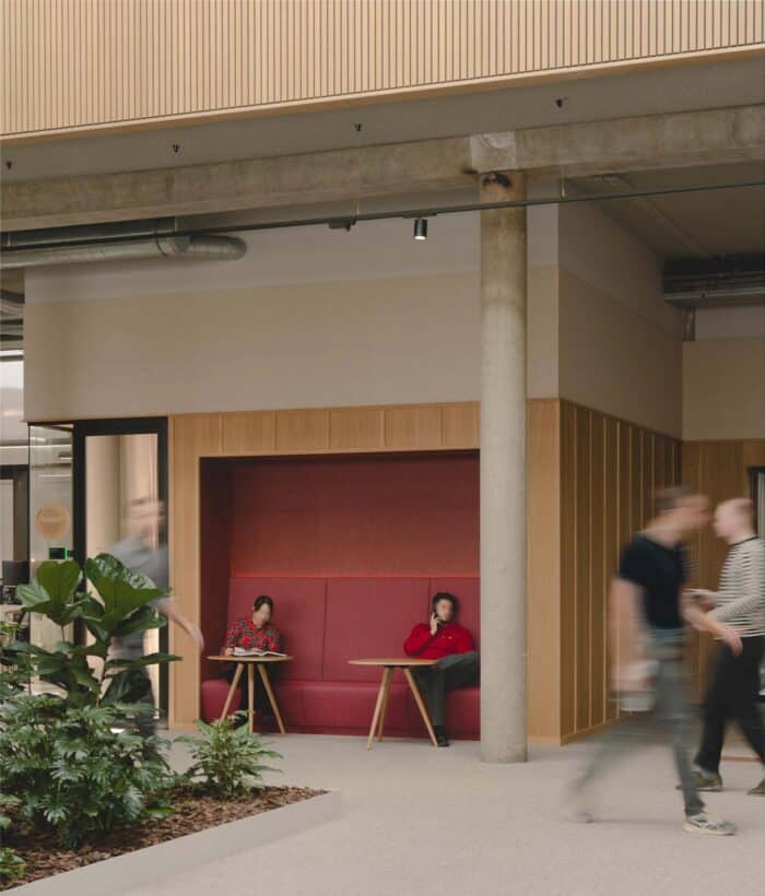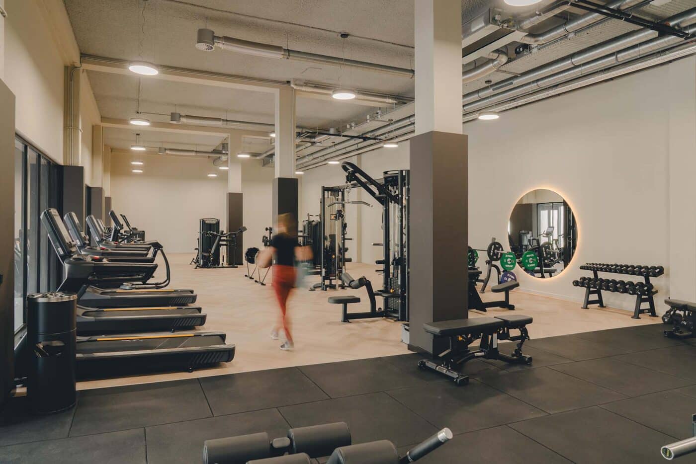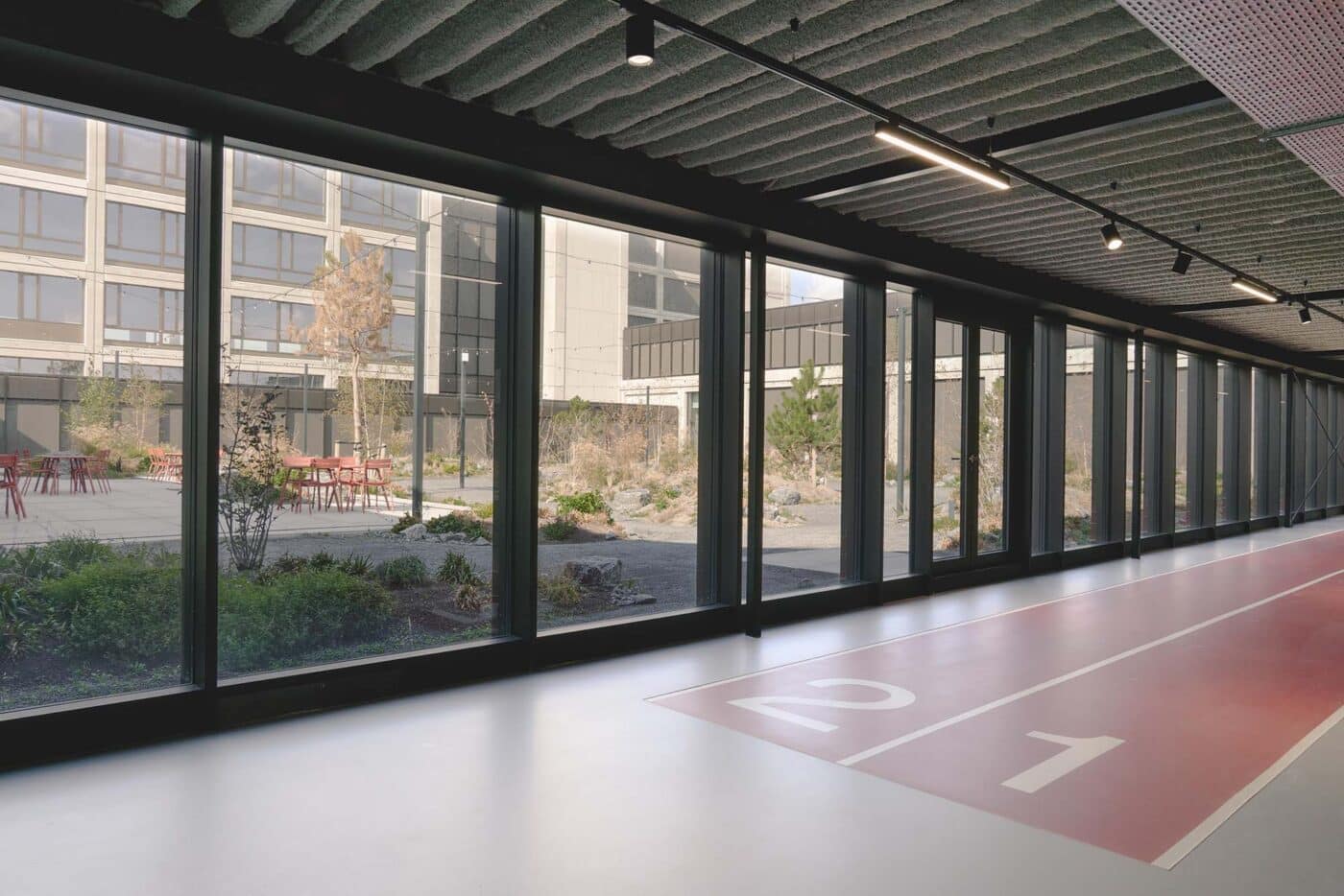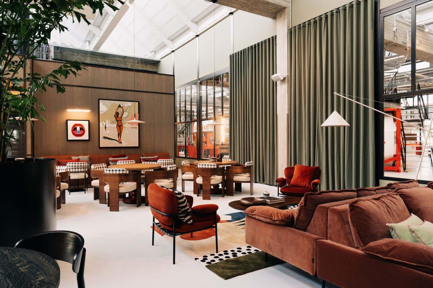 Basecamp is meer dan een werkomgeving: het is een fysieke vertaling van de cultuur van Den Hartogh. De royale nieuwe entree is direct verbonden met een koffiebar; stijlvol ingericht in donkere houttinten en messing details. Een wandvullende vitrinekast toont de rijke historie van het familiebedrijf als levend archief vol objecten en verhalen. Ook de Den Hartogh-visie op fun in business kreeg een ruimtelijke vertaling, een bewuste zoektocht naar de balans tussen werken en ontspannen. Zo leidt de route naar de fitnessruimte langs een eigen renbaan, staat centraal op begane grond een ‘denktank’ in een omgebouwde tankcontainer en wordt in de binnentuin dagelijks een potje jeu-de-boules gespeeld. Verspreid door het gebouw liggen tien karaktervolle stijlkamers, elk geïnspireerd op een facet van de Den Hartogh-cultuur. Er is een zachte vergaderruimte met uitzicht op de binnentuin, een projectkamer met geperforeerde gordijnen die het zicht focussen op een groot scherm, en een creatieve ‘muziekkamer’ vol platen, gameconsoles en brainstormtools. De ruimtes zijn ontworpen voor verschillende momenten in het werkproces – van focus tot co-creatie – en bieden telkens een ander ruimtelijk klimaat. Na werktijd kan er gesport worden bij de in-house fitnessruimte.