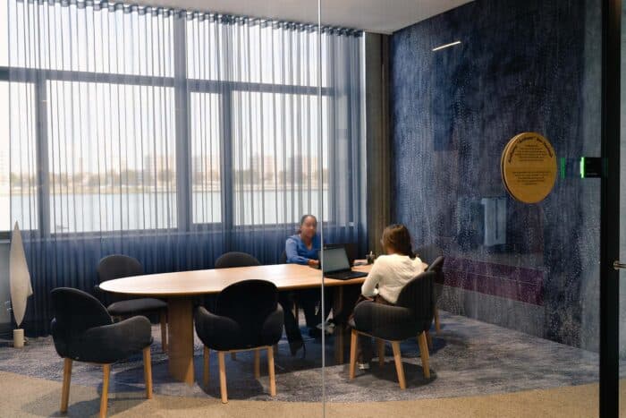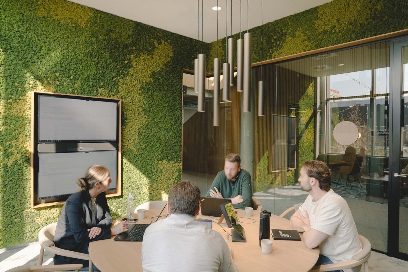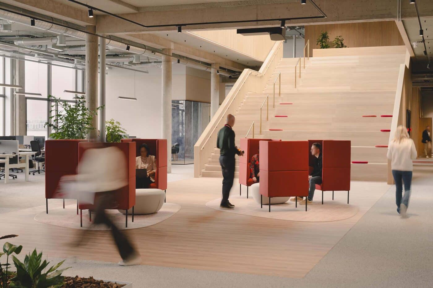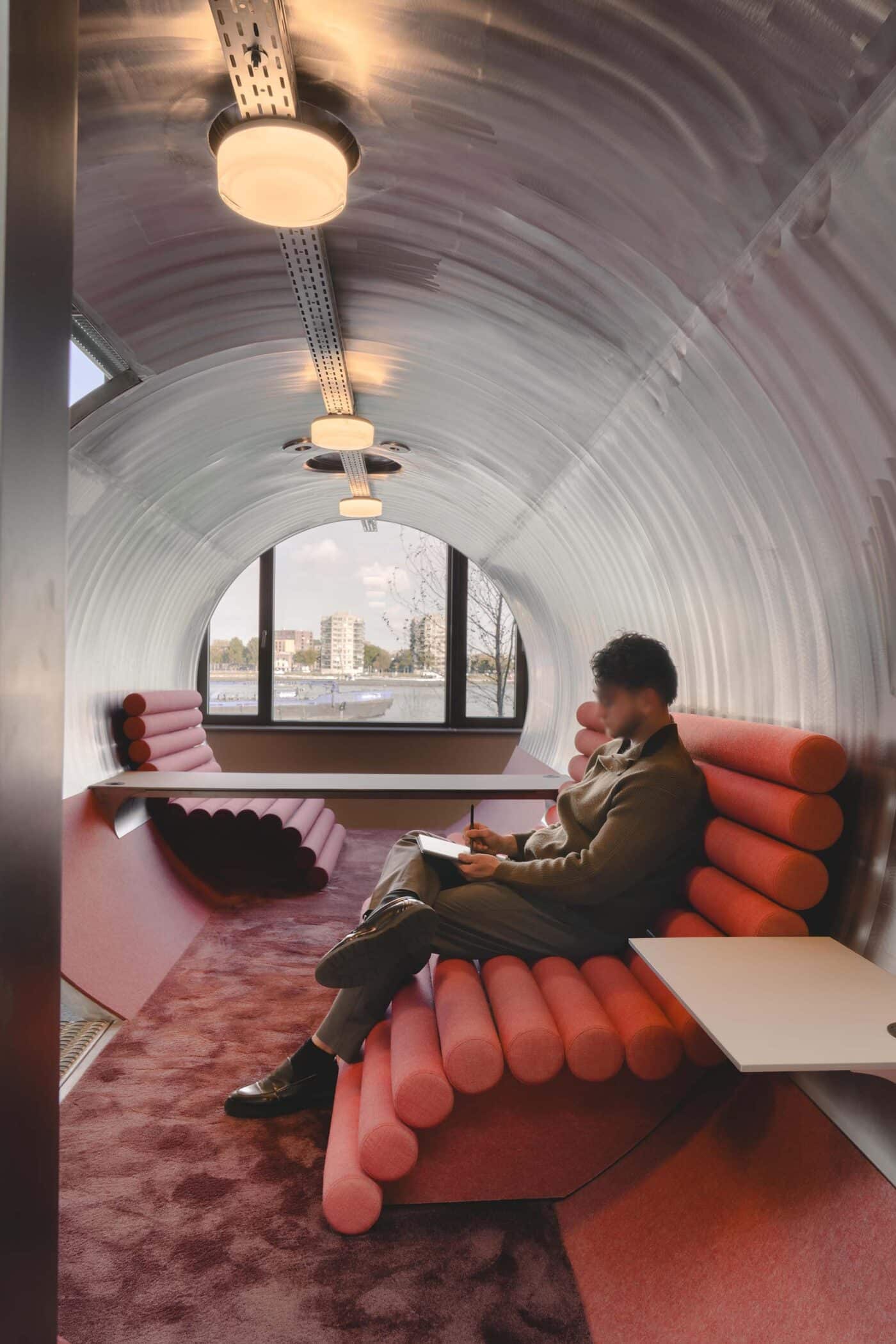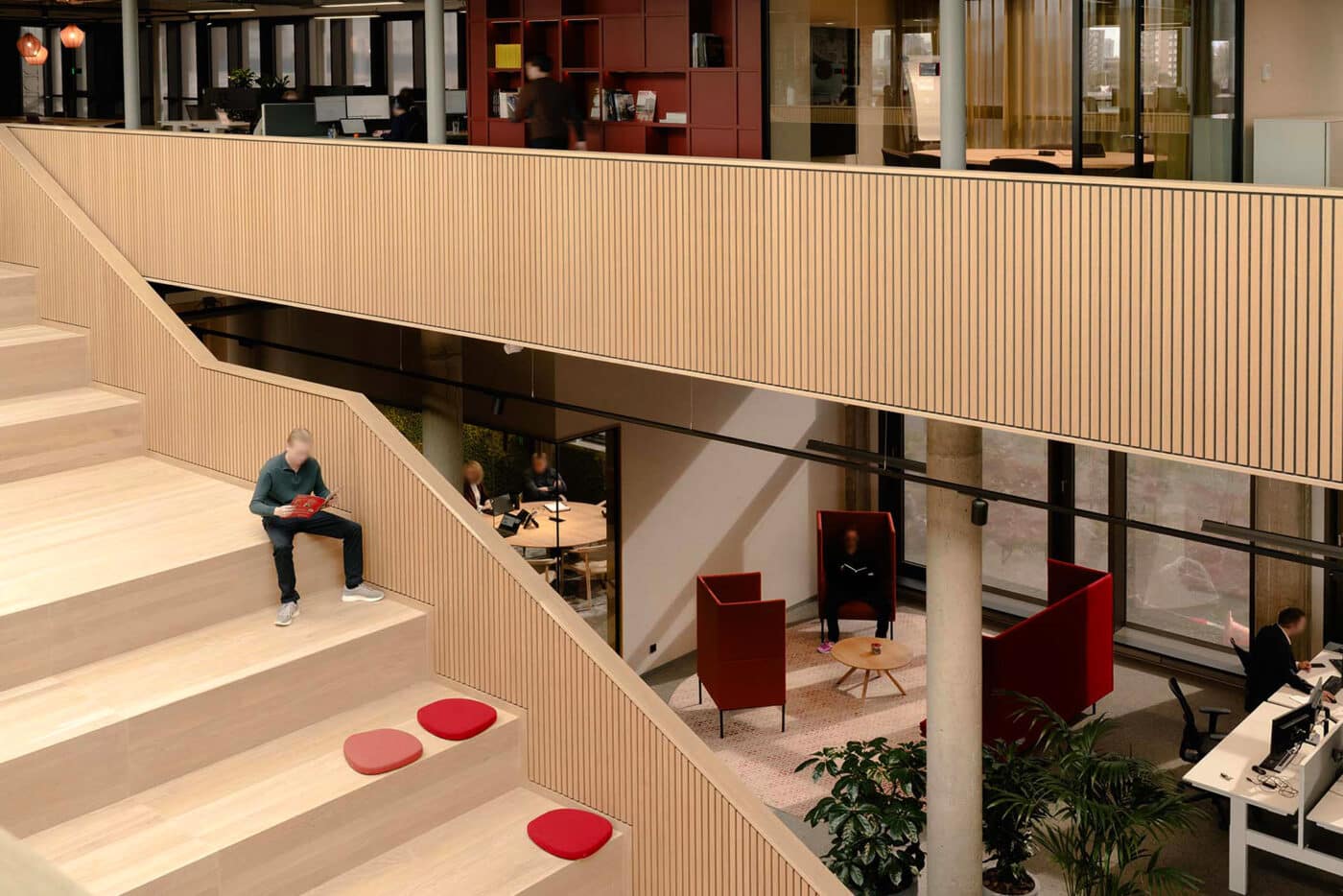 Basecamp is meer dan een werkomgeving: het is een fysieke vertaling van de cultuur van Den Hartogh. De royale nieuwe entree is direct verbonden met een koffiebar; stijlvol ingericht in donkere houttinten en messing details. Een wandvullende vitrinekast toont de rijke historie van het familiebedrijf als levend archief vol objecten en verhalen. Ook de Den Hartogh-visie op fun in business kreeg een ruimtelijke vertaling, een bewuste zoektocht naar de balans tussen werken en ontspannen. Zo leidt de route naar de fitnessruimte langs een eigen renbaan, staat centraal op begane grond een ‘denktank’ in een omgebouwde tankcontainer en wordt in de binnentuin dagelijks een potje jeu-de-boules gespeeld. Verspreid door het gebouw liggen tien karaktervolle stijlkamers, elk geïnspireerd op een facet van de Den Hartogh-cultuur. Er is een zachte vergaderruimte met uitzicht op de binnentuin, een projectkamer met geperforeerde gordijnen die het zicht focussen op een groot scherm, en een creatieve ‘muziekkamer’ vol platen, gameconsoles en brainstormtools. De ruimtes zijn ontworpen voor verschillende momenten in het werkproces – van focus tot co-creatie – en bieden telkens een ander ruimtelijk klimaat. Na werktijd kan er gesport worden bij de in-house fitnessruimte.