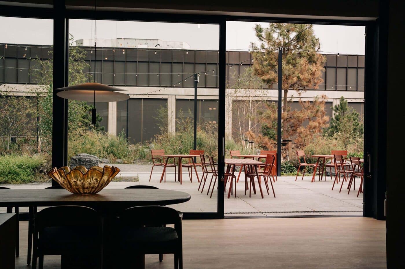 De kenmerkende sheddaken van de oude werkplaats zijn de achtergrond voor nieuwe sculpturale volumes die het restaurant intuïtief zoneren. Naar ontwerp van KingKongs heeft het restaurant een eigen karakter binnen het Basecamp. De Een warme vertaling van het Den Hartogh kleurpalet zoals terracotta, dieprood en zachte groenen wordt gecombineerd met hout en lichte neutrale materialen. De variatie in zitmogelijkheden, van lounge-achtige banken in leer en velours tot intieme tafeltjes, maakt de ruimte veelzijdig in gebruik. Via de daklichten en de glazen gevel reikt daglicht tot diep in het gebouw en lijkt de verbinding met de binnentuin en buitenterras bijna naadloos. Het restaurant grenst aan experience, waar bezoekers en opdrachtgevers een kijkje krijgen in de wereld van Den Hartogh. Hier worden ook nieuwe chauffeurs worden opgeleid in een eigen academy.