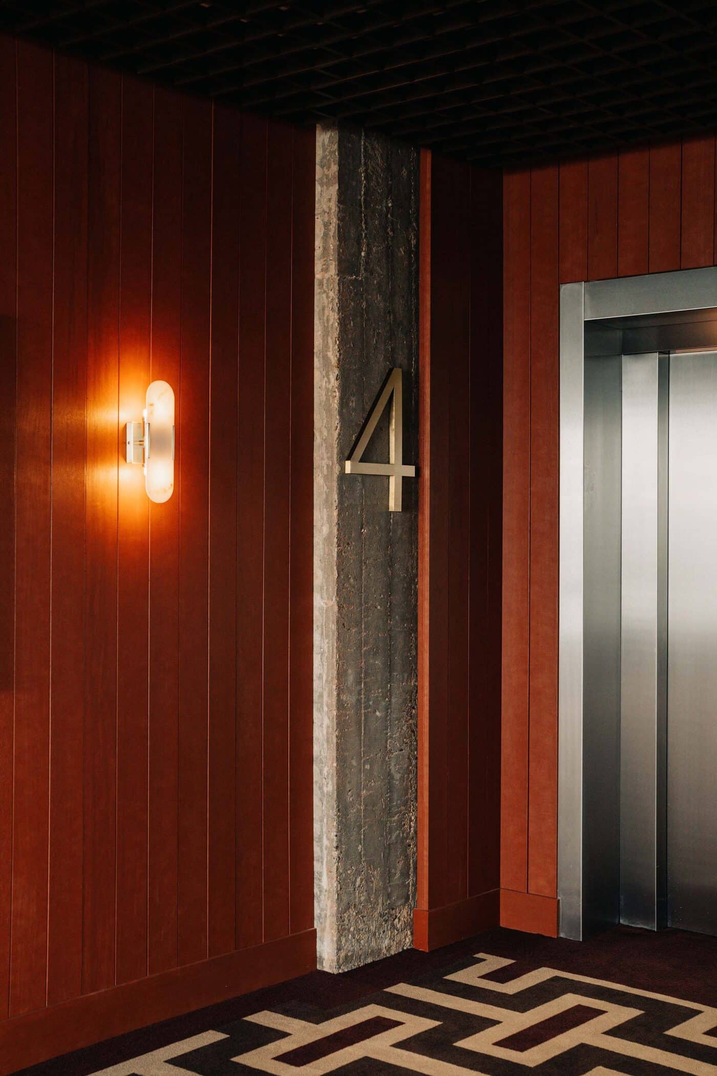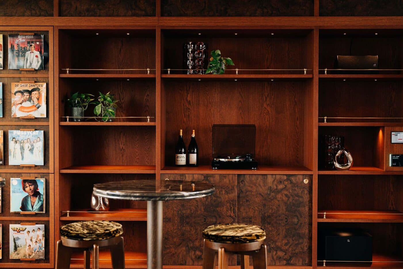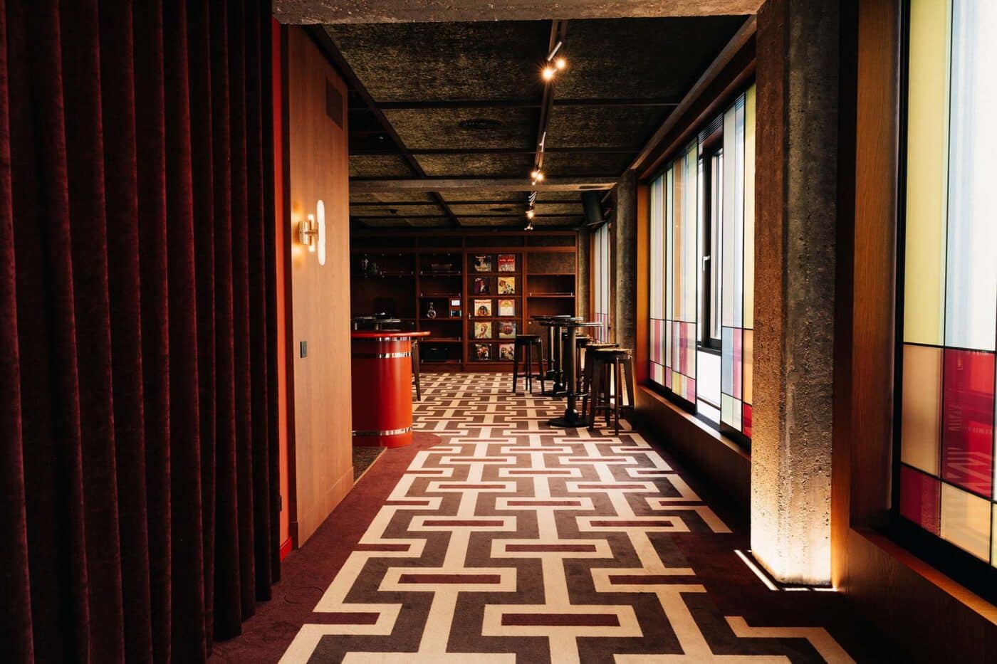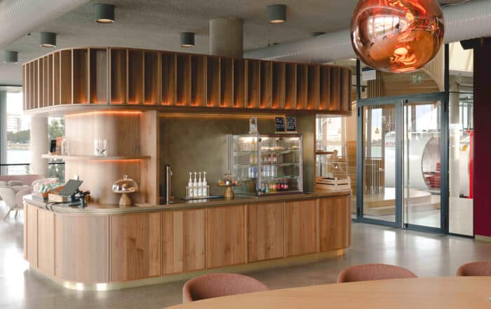 Op de bovenste verdieping een skybar die aanvoelt als een hotelbar; warm, uitnodigend en een tikje mysterieus. Een eigen wereld in de top van het gebouw. Rijke materialen als wortelhout en velours worden gecombineerd met diepe bordeauxrode tinten en opvallende grafische patronen. Het uitzicht over het water geeft een gevoel van vrijheid, terwijl de ruimte zelf je omhult met een warme, verfijnde schil.