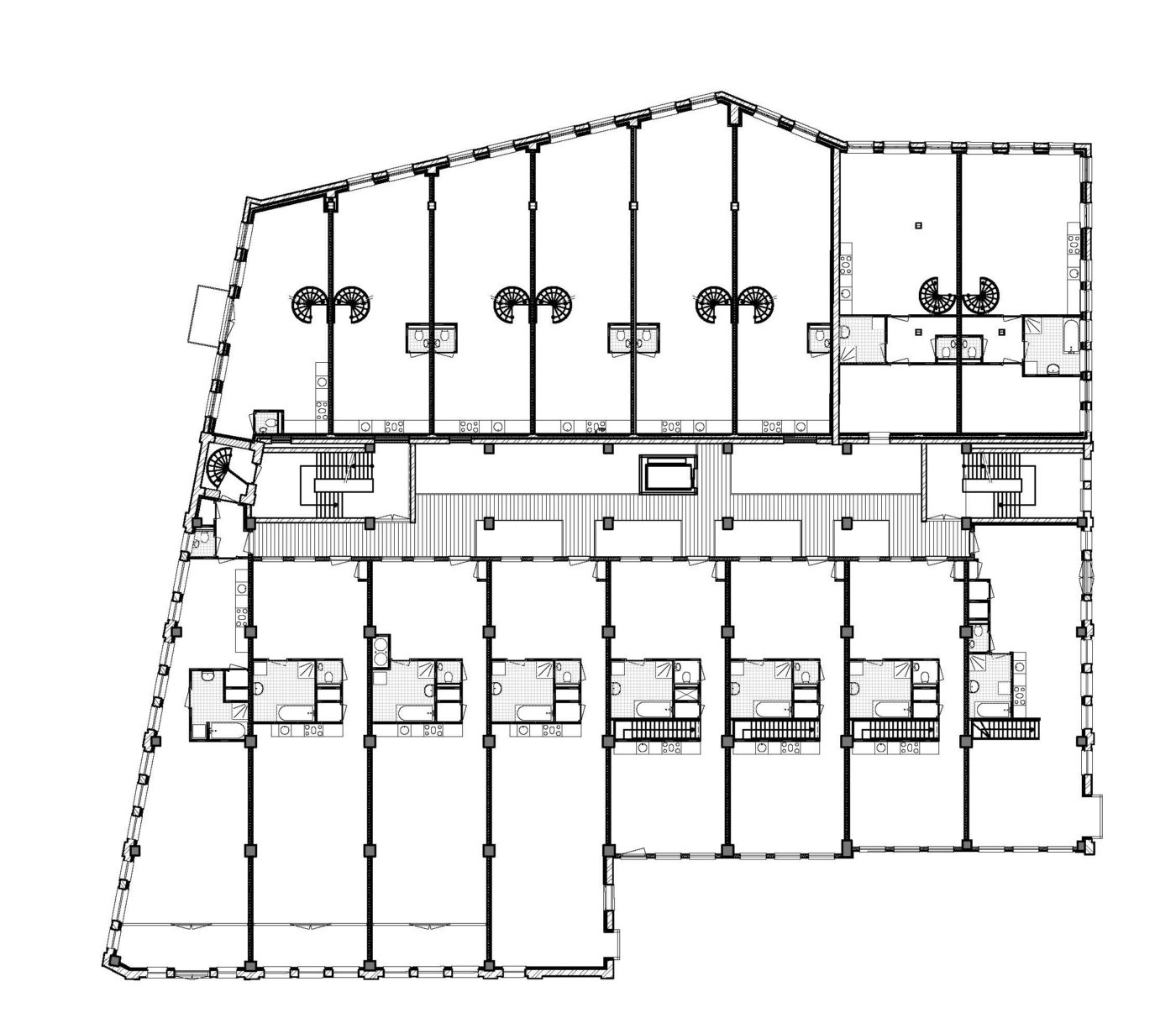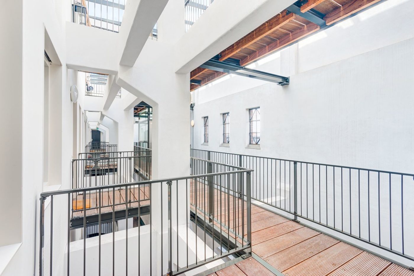 In het hart van het gebouw realiseerden wij een langgerekt licht atrium dat de woningen ontsluit
