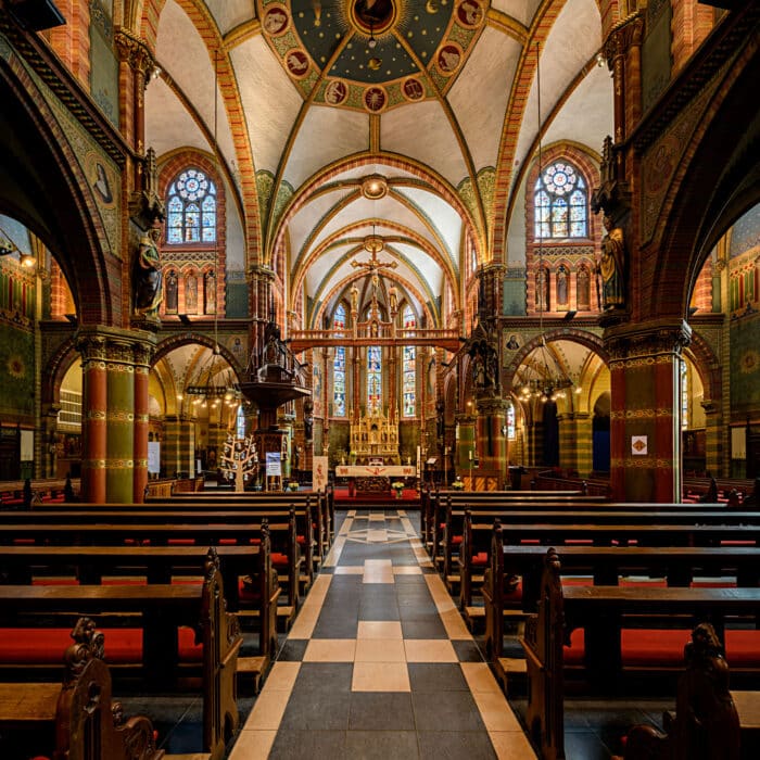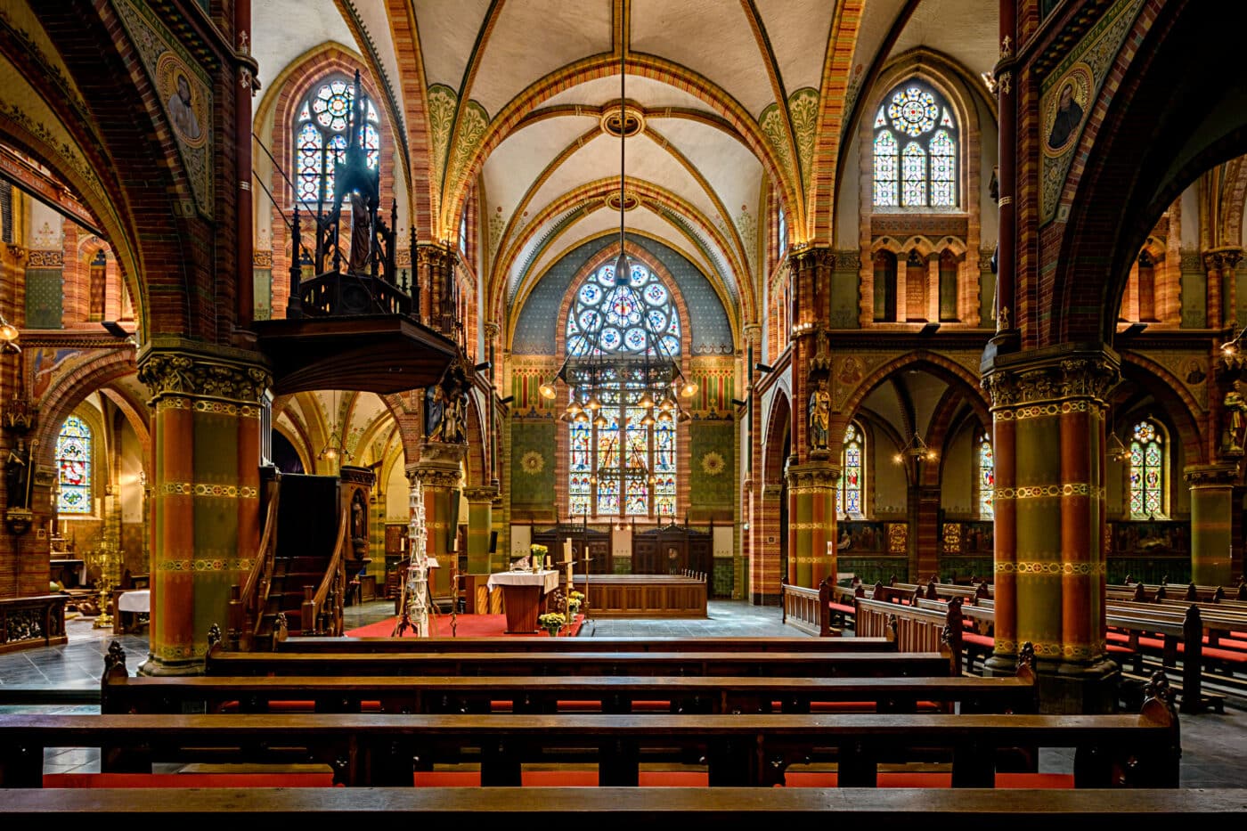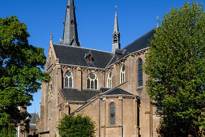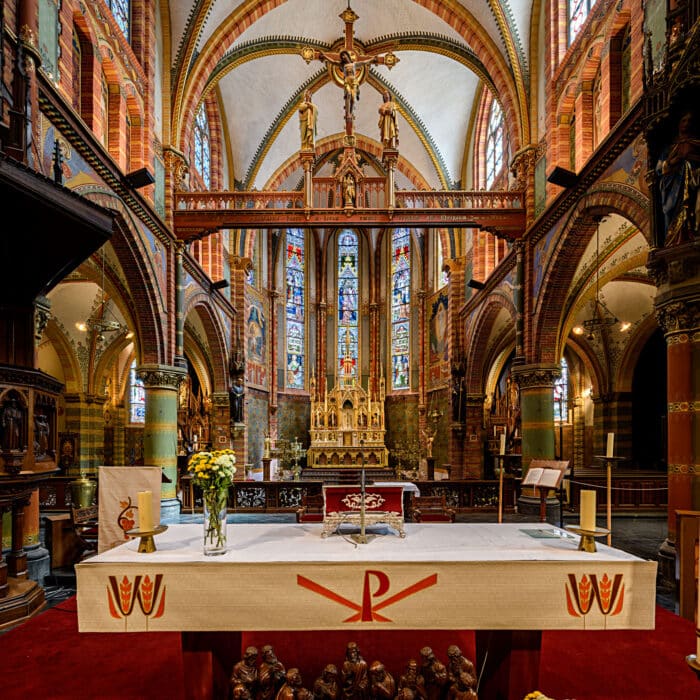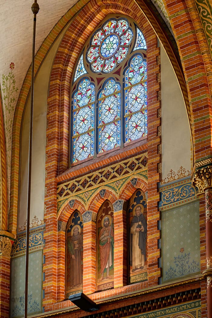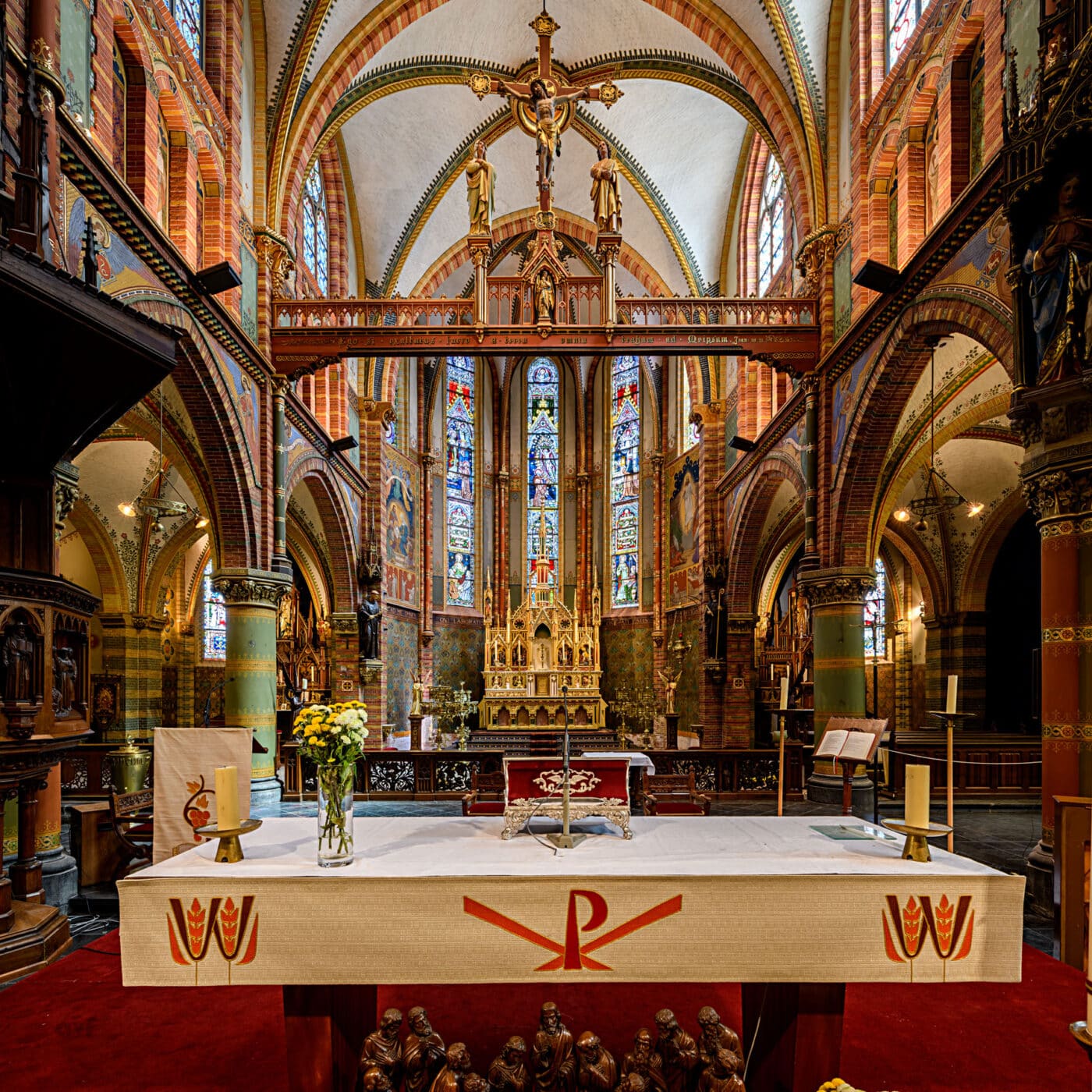 De majestueuze neogotische kruiskerk is gebouwd in 1882 en destijds ontworpen door Evert Margry, leerling van de beroemde architect Pierre Cuypers. Het gebouw laat zich kenmerken door de rijke en verfijnde decoraties zoals de fraai geïllustreerde dierenriem in het gewelf van de viering, het polychromeerwerk op de kolommen en wanden, en natuurlijk maken de gebrandschilderde glas-in-lood ramen het gebouw als gesamtkunstwerk compleet. Inmiddels tien jaar geleden werd Braaksma & Roos Architectenbureau gevraagd voor de restauratie van het koor, maar na een gedegen opname bleek dat de gehele fundering van de kerk volledig was verzakt. Om een duurzame restauratie te kunnen realiseren was ons oprechte advies om eerst de funderingsconstructie te herstellen, om zo een goed resultaat op de lange termijn te waarborgen. Een advies dat het startsein voor een jarenlange succesvolle samenwerking bleek!