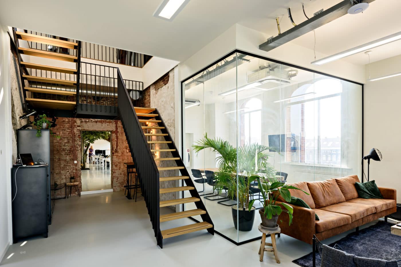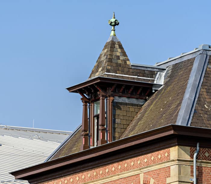 De verdieping en kap van het gebouw, oorspronkelijk gebruikt als dienstwoningen van de stationschef en -opzichter, zijn getransformeerd tot lichte werkruimten, ontsloten door een eigen entree in de toren van het station. De stevige kapconstructie is in het zicht gelaten en op verschillende plekken is zijn de monumentale gemetselde muren onbewerkt in het zicht gelaten. Aan de zijde van het park is over de gehele breedte van de kap een lichtstraat aangebracht die de werkruimten tot een lichte en prettige omgeving maakt. De donkere lamellen laten de lichtstraat aan de buitenzijde op een subtiele manier overgaan in het donkere pannendak. Het monumentale aanzicht van het station aan het stationsplein is volledig gekoesterd en nauwkeurig gerestaureerd. Dankzij historisch kleurenonderzoek is het schilderwerk van de kozijnen, daklijsten en dakkapellen in de oorspronkelijke kleuren hersteld. Ingrepen zijn beperkt tot het toevoegen van daklichten in de zijkanten van de kappen van het midden- en zijpaviljoen.