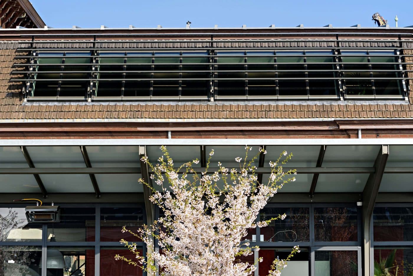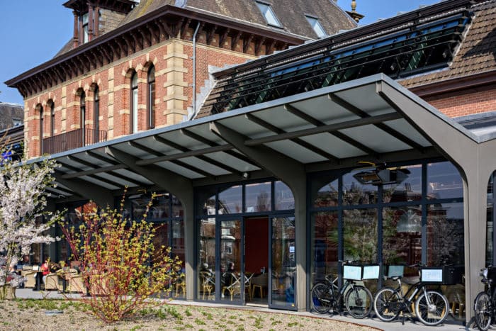 Aan de voorzijde sluit het stationsgebouw naadloos aan op het voorplein met het busstation. Bezoekers van het restaurant betreden het gebouw vanaf de stoep via het brede bordes naar de centrale hal, precies zoals men dat vroeger deed om de trein te halen. Aan de achterzijde is de situatie flink veranderd. Waar oorspronkelijk direct aan de achterzijde van het stationsgebouw de perrons en sporen lagen, is het nieuwe, verhoogde Park Spoorloos aangelegd, waaronder zich de fietsenstalling bevindt. De aansluiting tussen gebouw en park wordt versterkt door het ontwerp van de nieuwe “perronoverkapping”, een nieuwe serre over de gehele breedte van het stationsgebouw met donkere stalen spanten en een transparante gevel die doet denken aan de oorspronkelijke overkapping boven perron 1. De serre is voorzien van grote te openen glazen puien die in de zomer toegang bieden tot het terras dat onderdeel uitmaakt van het park.