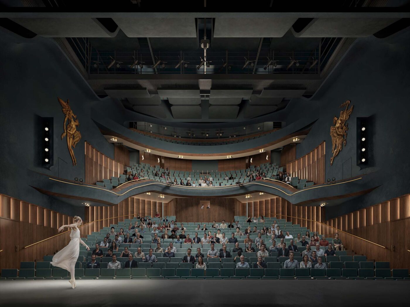 Met een frisse blik keek het ontwerpteam naar het rijke ontwerp van het monument en vond hier verrassende inspiratie voor de routing, beleving en opbouw van het ensemble. In ons ontwerp smelten oud en nieuw samen tot één geheel, met de historische façade in de hoofdrol. Het verbeteren van het contact tussen het Stadstheater en publiek, makers, stad en omgeving is de hoofdambitie van de visie. Er komen toegankelijke tuinen rondom het gebouw en het vrachtvervoer wordt daarvoor via één centrale aansluiting vanaf de Singel afgehandeld. De compacte en ingetogen vormgeving van de uitbreiding brengt de aandacht naar het art-deco-monument, dat in ere wordt hersteld als hoofdentree. Door de logistiek in het hart van het gebouw te clusteren, ontstaat een ‘theatermachine’ met korte lijnen. De publieksgebieden in het theater worden verbonden met de buitenruimte, en zijn daarmee een verlengstuk van de binnenstad en onderdeel van de nieuwe stadsoase.