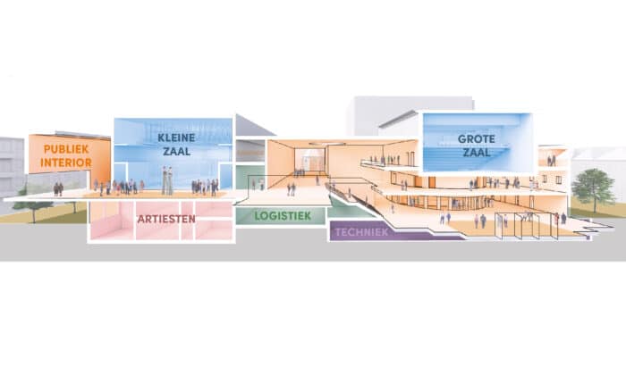 Aan het ontwerpteam de vraag om het verouderde theatergebouw om te toveren naar een modern Stadstheater. Daarbij is het behoud van het rijke historische karakter een belangrijke pijler. De monumentale Grote zaal wordt geoptimaliseerd om na de renovatie ruimte te bieden aan 725 bezoekers. Daarnaast wenst het theater een nieuwe kleine theater- en danszaal, een repetitie- en educatiezaal en een reeks nieuwe en multi-inzetbare foyers. Het ontwerpteam is ook gevraagd om het interieur van de renovatie integraal mee te ontwerpen. Het nieuwe theatergebouw is de eerste stap in de metamorfose van het Koningspleingebied tot een groene stadsoase.