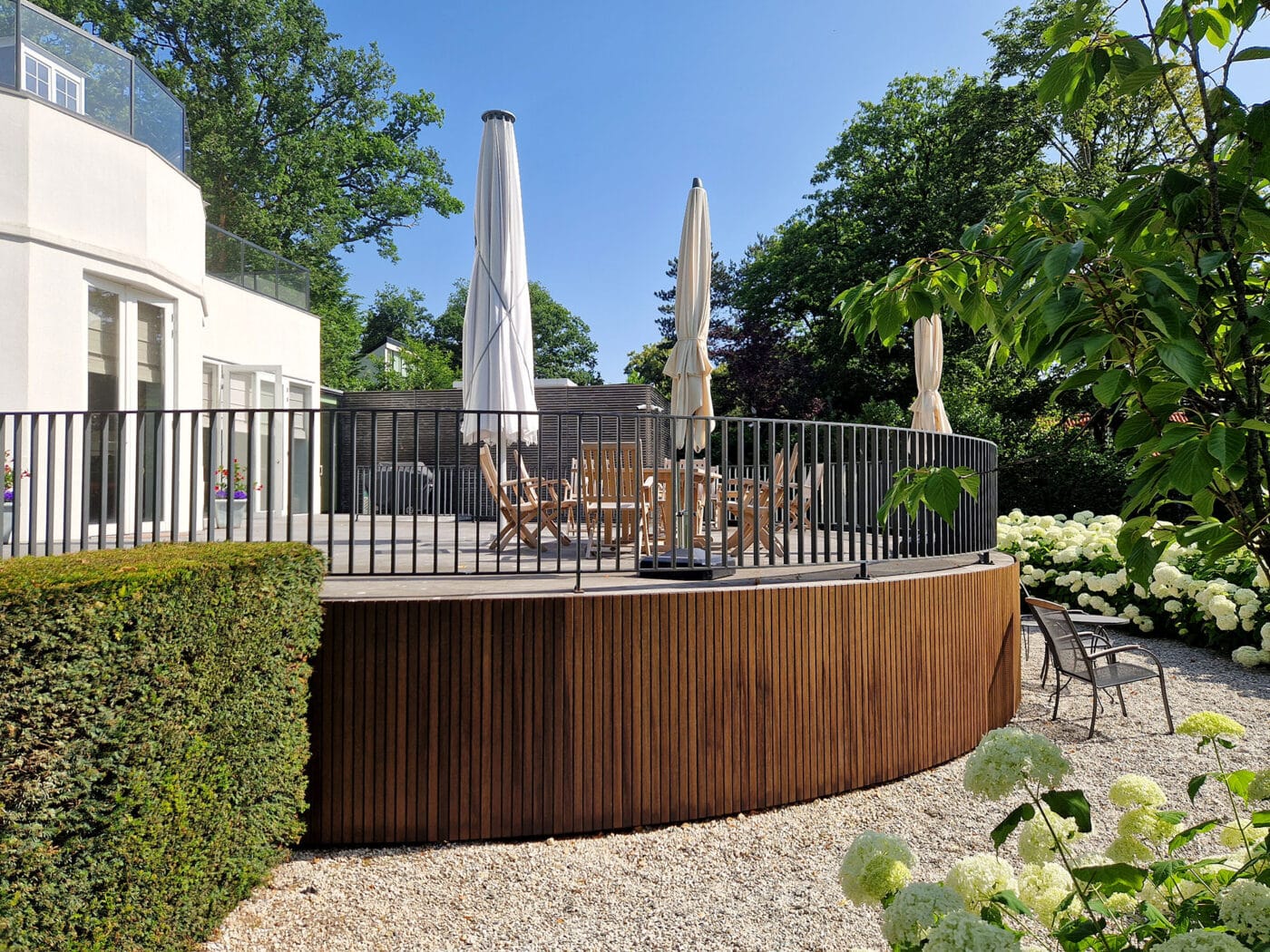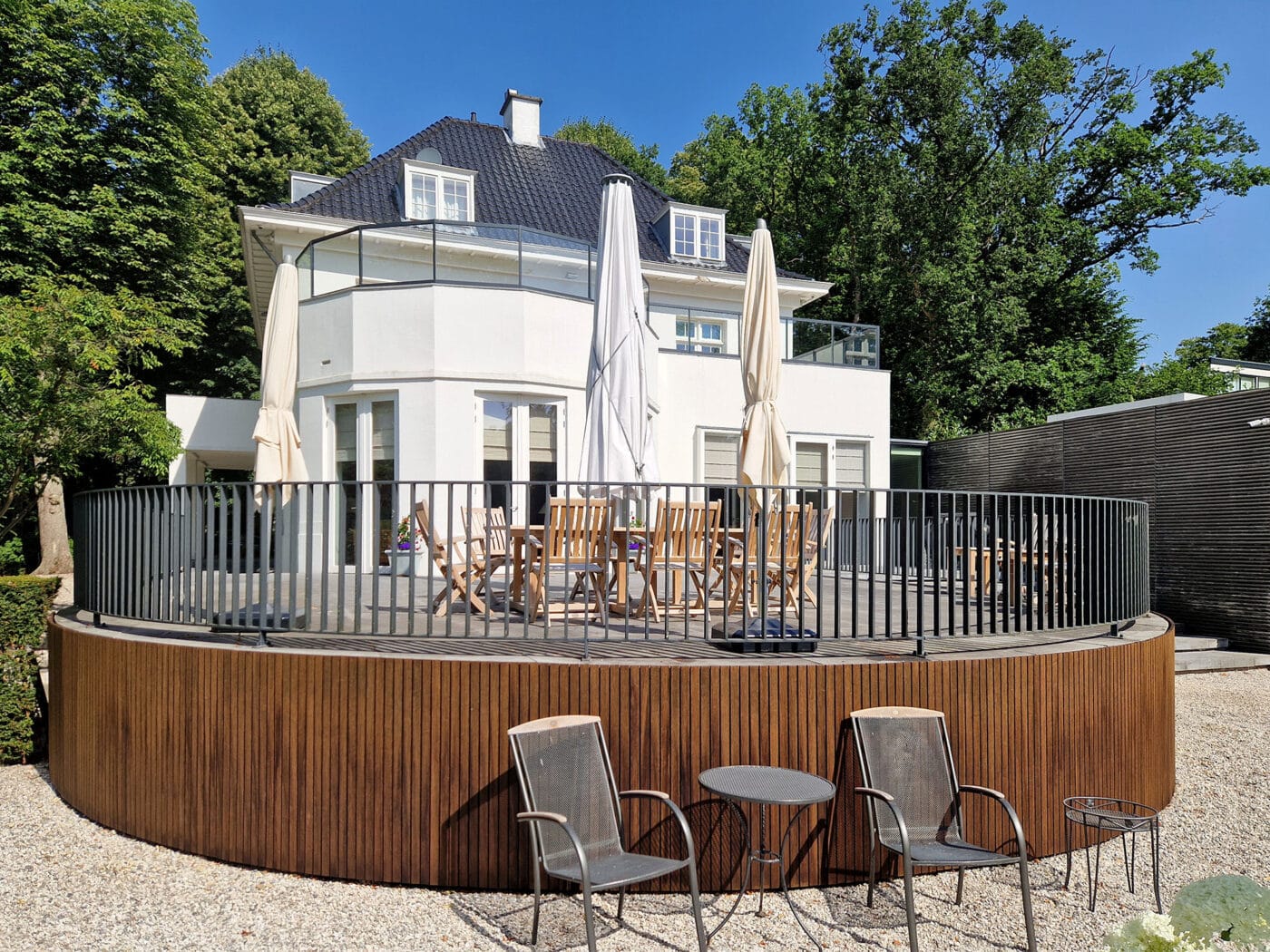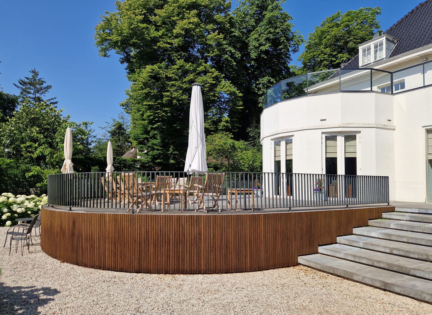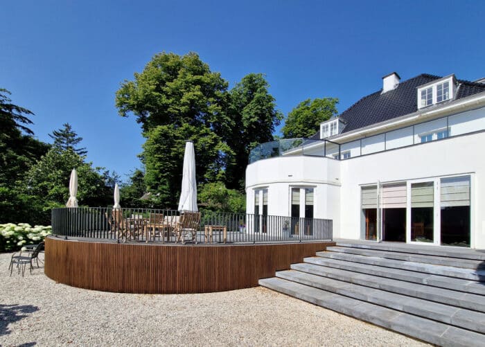 In korte tijd is een zichtbare metamorfose gerealiseerd. De gevel is bekleed met een warme, duurzame bamboe bekleding die het terras visueel in balans brengt met de villa. De natuurlijke vergrijzing van het materiaal zal de uitstraling de komende jaren alleen maar versterken. De betonnen trap is schoongemaakt en de vochtproblemen van de kelder zijn opgelost met maatwerk bouwfysische oplossingen en verbeterde ventilatie. Alle ingrepen zijn slim afgestemd op toekomstige plannen voor aanvullende werkzaamheden. Hierdoor is het project niet alleen feestklaar, maar ook toekomstbestendig opgeleverd.