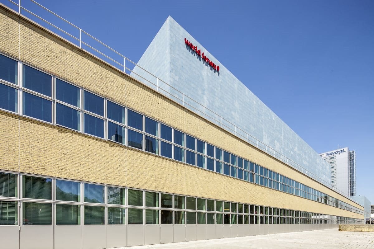 In opdracht van de gemeente Den Haag en exploitant GL Events werkt Braaksma & Roos Architectenbureau sinds 2013 aan een integrale renovatie en verduurzaming van het omvangrijke complex. De focus ligt hierbij op het conserveren van het casco, isolatie van de buitenschil en verbetering van de installaties. Alle ramen en entrees zijn vervangen voor driedubbel glas in nieuwe aluminium puien en kozijnen met dezelfde detaillering als de oorspronkelijke profielen uit de jaren ‘50. Tevens is 9.300 m2 dakisolatie aangebracht en is een extensief groendak van 6.000 m2 aangelegd. Met 400 zonnepanelen levert het World Forum zelfs stroom aan de hele wijk.In het interieur zijn de sanitaire voorzieningen volledig vernieuwd en zijn alle installaties en lichtbronnen vervangen, wat eveneens tot een lager verbruik heeft geleid. Tot slot hebben wij het World Forum onder de luifel van de voorgevel uitgebreid met expositie- en congresruimten.