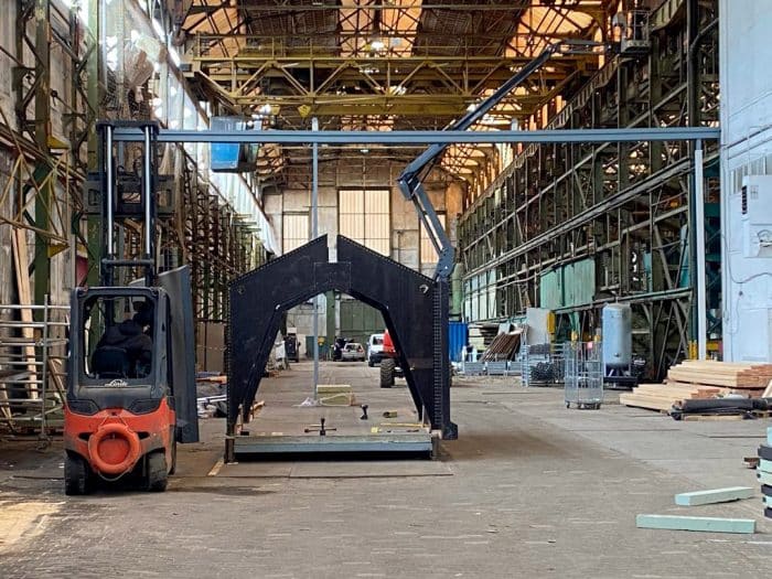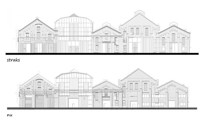 “Van oorsprong hadden de vijf hallen een rijk silhouet; de daken waren voorzien van stoomkappen, schoorstenen en verschillende aan- en opbouwen in de vorm van kranen en andere hijsconstructies. Dit silhouet is in de loop der jaren flink verschraald maar krijgt nu weer karakter terug. Een herinterpretatie van de stoomkappen wordt teruggeplaatst op de daken. In combinatie met zonnepanelen spelen deze straks een belangrijke rol bij de energieprestatie van het complex.”